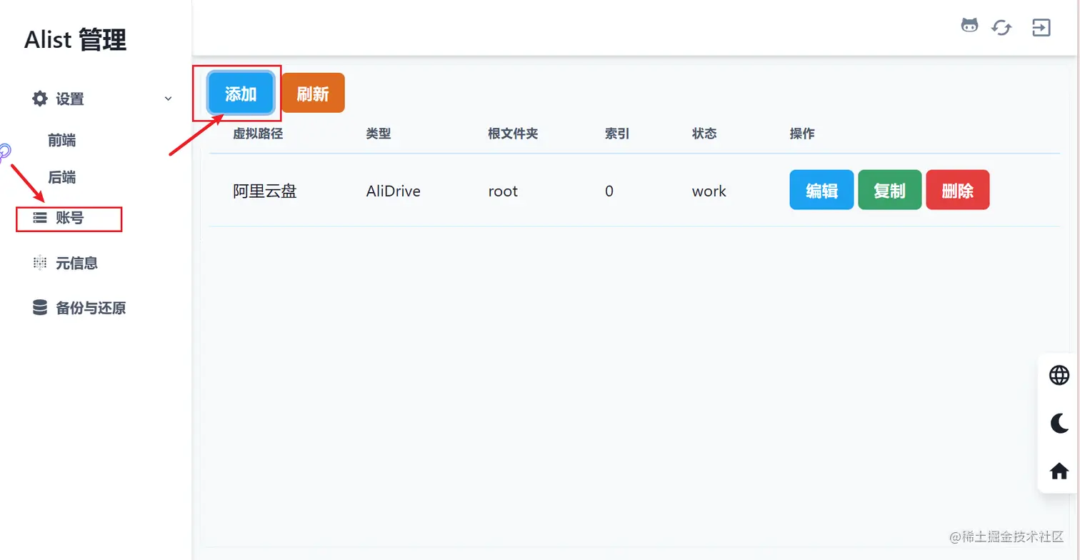 点击账号 -> 添加,选择阿里云盘