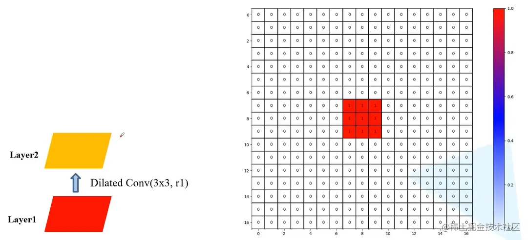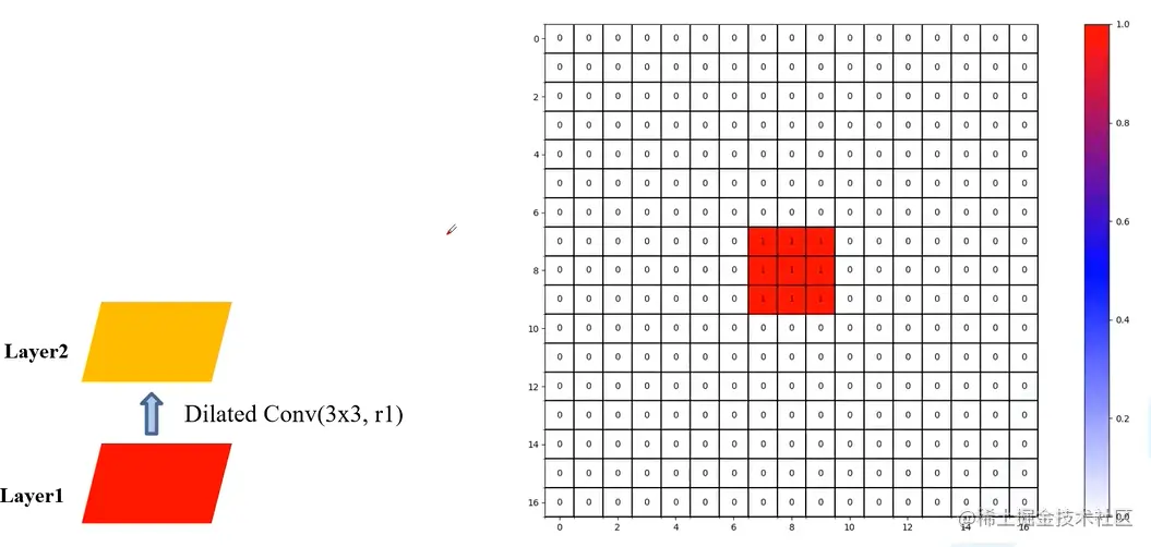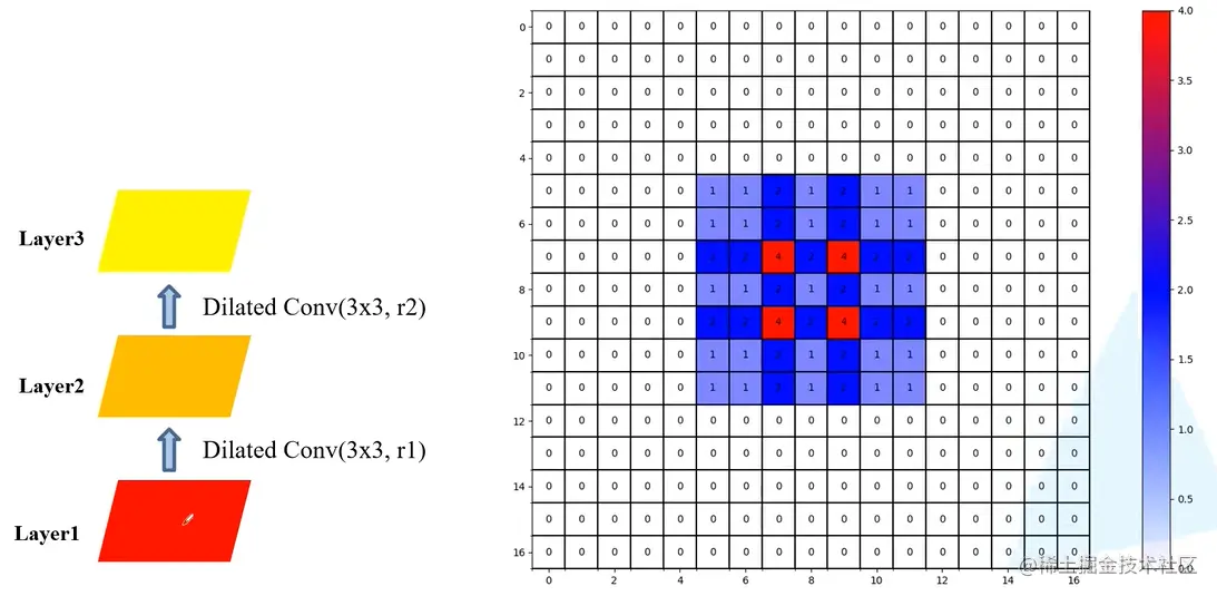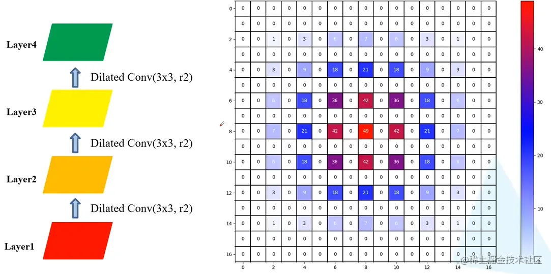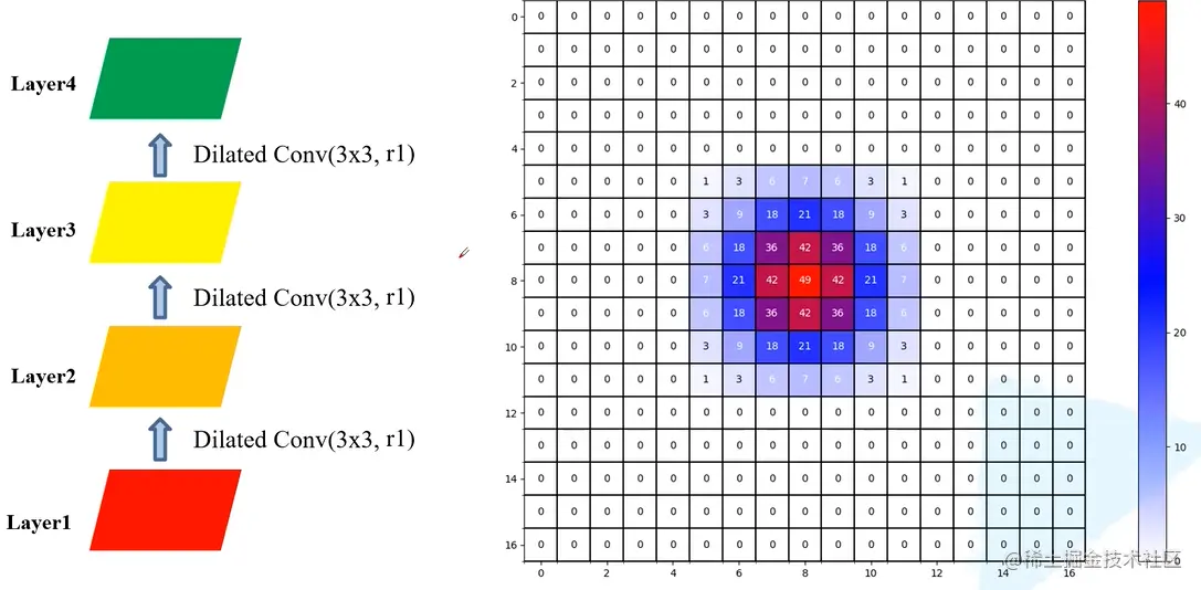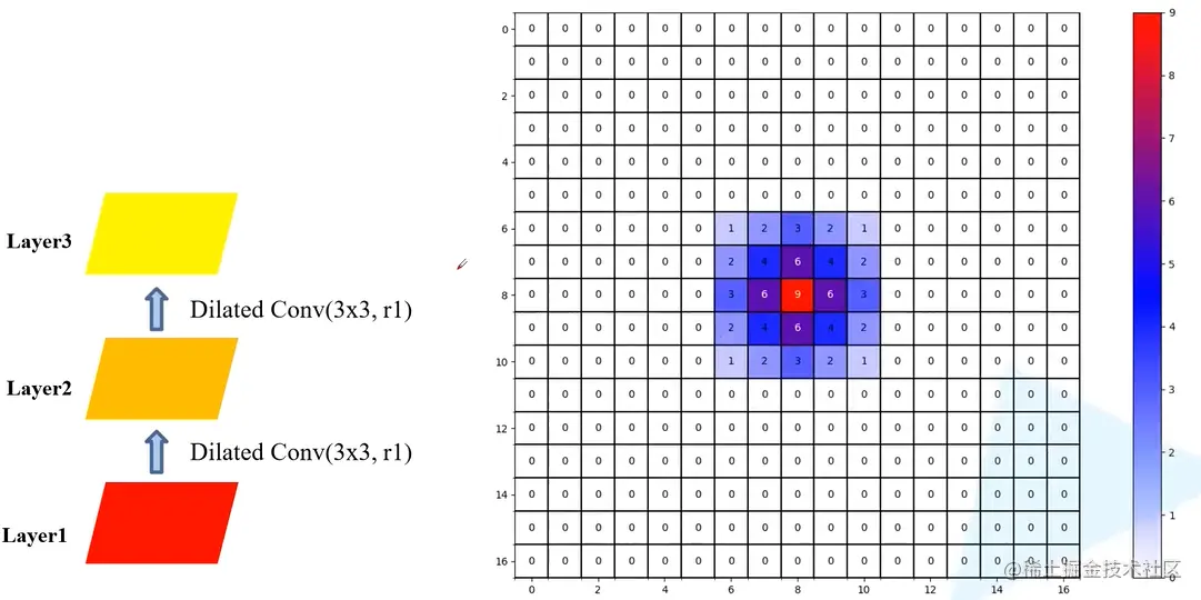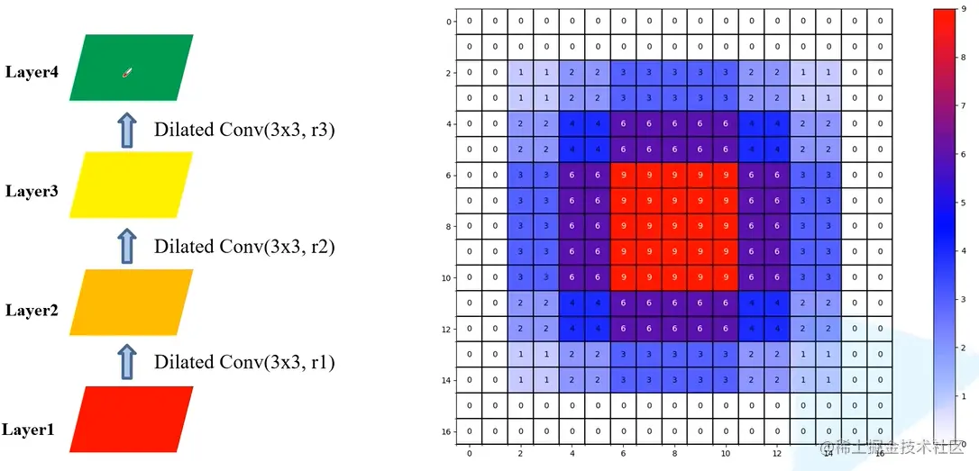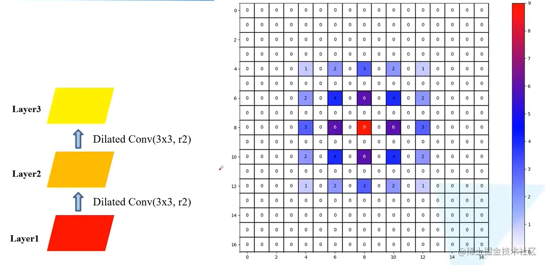 可以看到,在参数数量相同时,这里卷积核大小都为3×3,普通卷积的感受野为7×7,而膨胀卷积感受野为13×13。