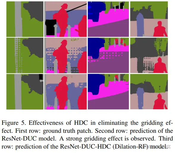 第一行是GT,第二行是没有按照本文描述的方法使用的膨胀卷积,第三行是按照本文描述方法使用的膨胀卷积