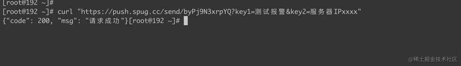 [root@manage]# curl "https://push.spug.cc/send/byPj9N3xxxYQ?key1=测试报警&key2=服务器IPxxxx"