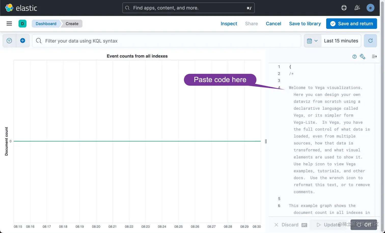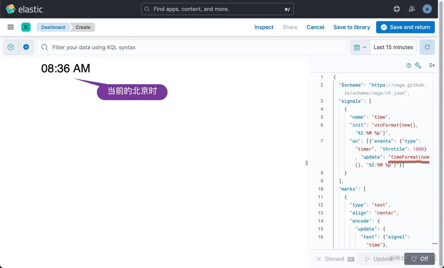 在有些大屏幕或者 dashboard 中,我们显示当前的时间会更人性化。在我们目前 Kibana 所提供的可视化里没有任何一个可视化能做到这一点,那么我们该如何做到呢?根据在 Elastic 社区论坛里的讨论,我们可以试验 Vega 来做一个定制化的可视化组件。下面我来展示如何进行。在下面的展示中,我将使用最新的 Elastic Stack 8.5.3 来进行展示。