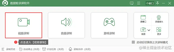 **步骤1:**进入到数据蛙录屏软件的主界面后,依照自身的需求选择录制模式。比如选择“视频录制”的录制模式。