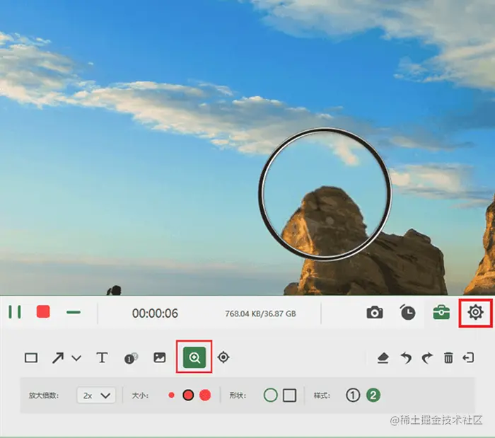 **步骤3:**在录制的过程中,可以使用工具箱的工具对录制画面进行编辑处理。比如使用“放大镜”工具,放大某个画面,突显出画面重点。