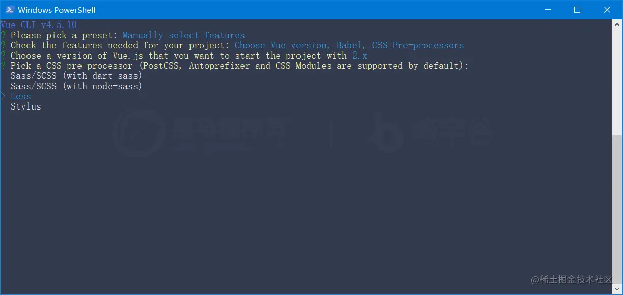 步骤4: 使用上下箭头选择要使用的 css 预处理器,并使用回车键确认选择: