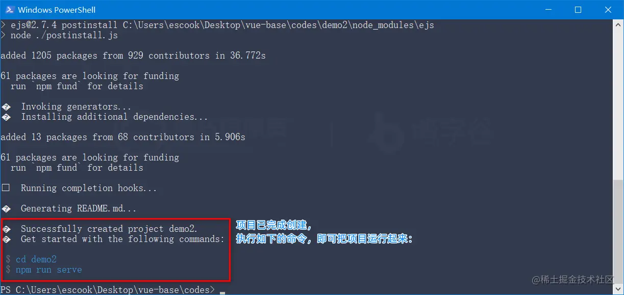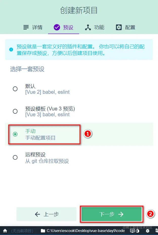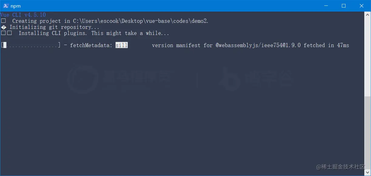 步骤1: 在终端下运行vue create demo2命令,基于交互式的命令行创建 vue 的项目: