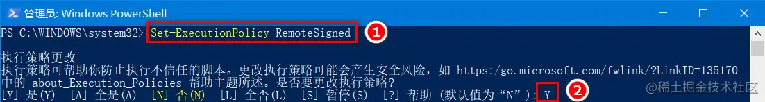 ②执行set-ExecutionPolicy RemoteSigned 命令