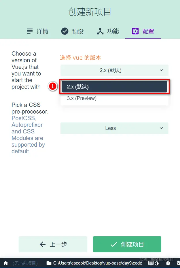步骤5: 在配置页面勾选vue 的版本和需要的预处理器: