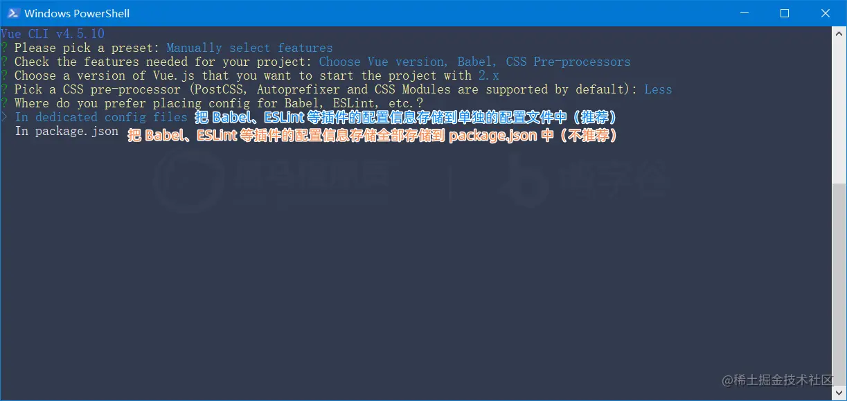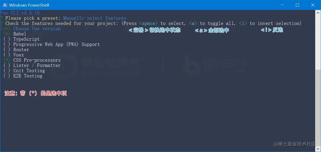 步骤4: 在功能页面勾选需要安装的功能(Choose Vue Version、Babel、CSS 预处理器、使用配置文件):