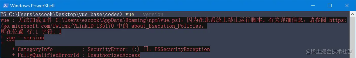 默认情况下,在PowerShell 中执行vue --version 命令会提示如下的错误消息: