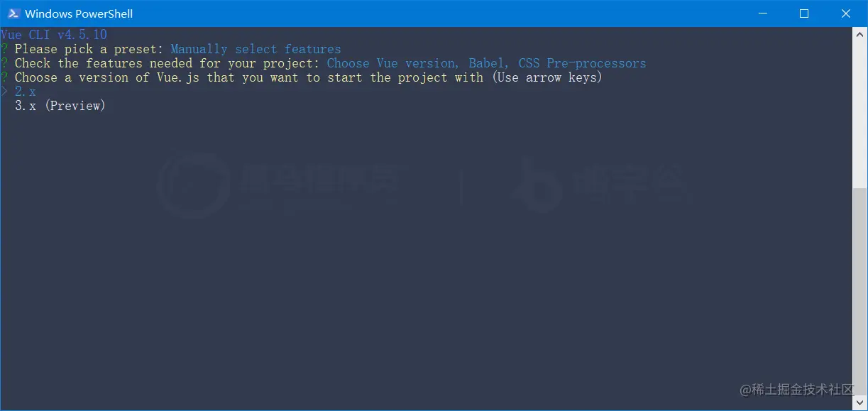 步骤3: 使用上下箭头选择 vue 的版本,并使用回车键确认选择: