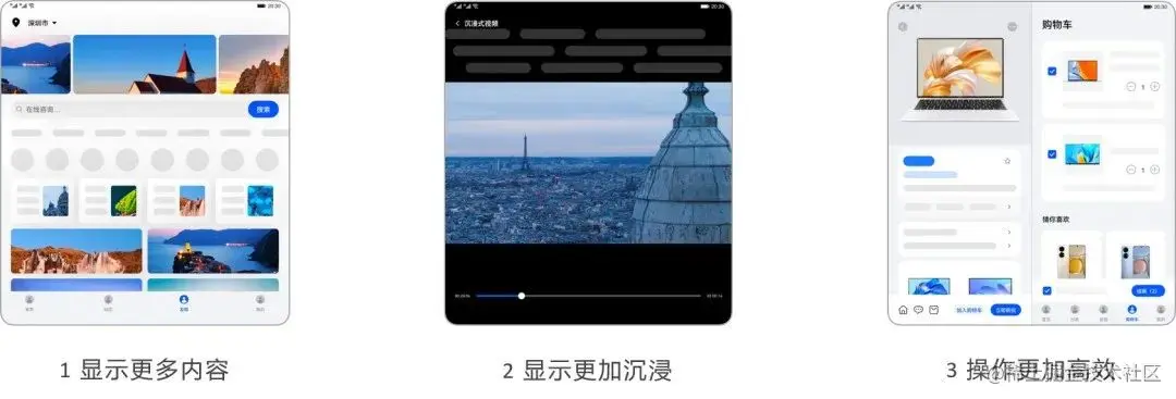 在折叠屏展开时,通过精心的设计可以为用户提供三种令人愉悦的增值体验:显示更多内容、显示更加沉浸、操作更加高效。