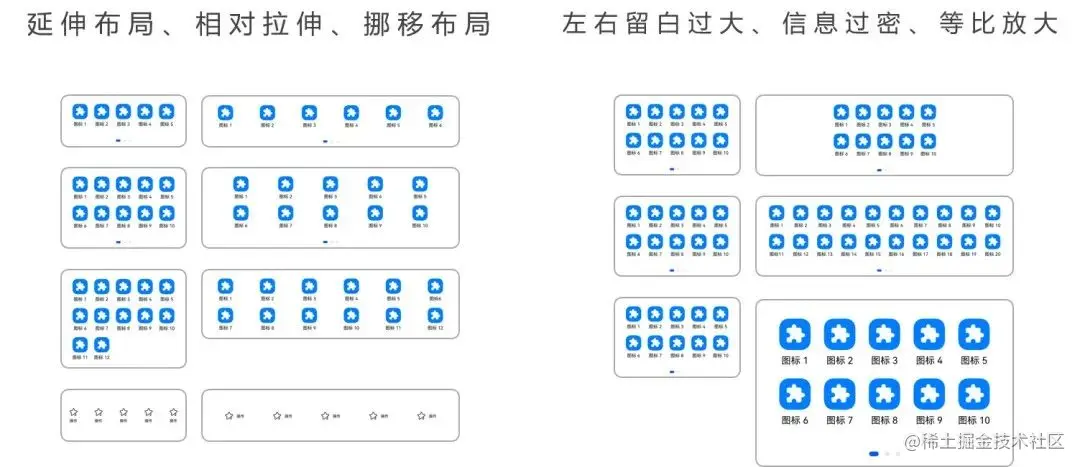 入口图标:可通过延伸布局、相对拉伸、挪移布局做到均衡地显示合适的图标数量,需要避免在展开态左右留白过大、一排显示的入口图标太多、以及直接放大等效果很差的做法。