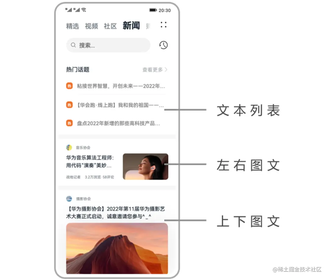 再举一个新闻类应用开发示例,我们可以基于文本列表、左右图文、上下图文这三种情况调整。