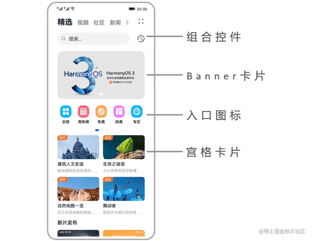 首先以一个内容类应用的首页为例,说明如何让这个页面显示更多的内容。示例中的这个页面包含了组合控件、Banner卡片、入口图标、宫格卡片这四个版块,我们分别看看每一个版块应该采用哪种布局规则。