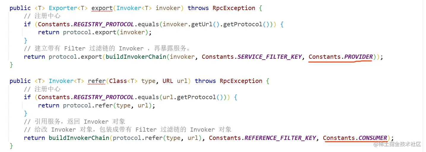进入到核心类ProtocolFilterWrapper中,在实现类中export和refer,都采用相同的构造责任链方法buildInvokerChain,只是通过参数group进行区分