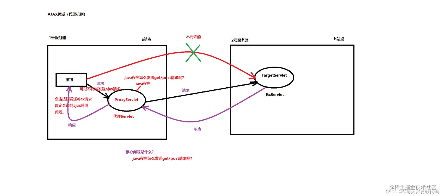 (1)代理机制:既然服务及不能直接跨域发送Ajax请求访问;那么先不跨域发送Ajax请求给Servlet,然后在通过这个Servlet(java代码)发送请求进行跨域访问!
