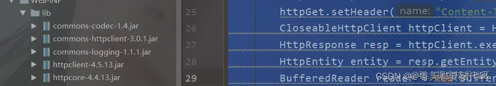 ②使用httpclient组件,需要将这个组件相关的jar包引入到项目当中。