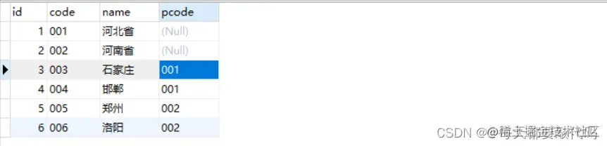 id(PK-自增) code(编号) name(名字) pcode(父编号)