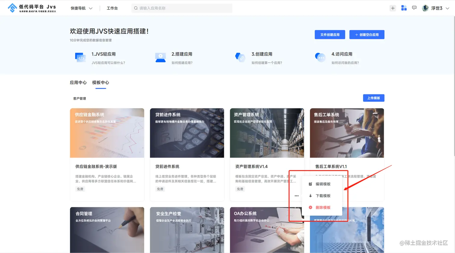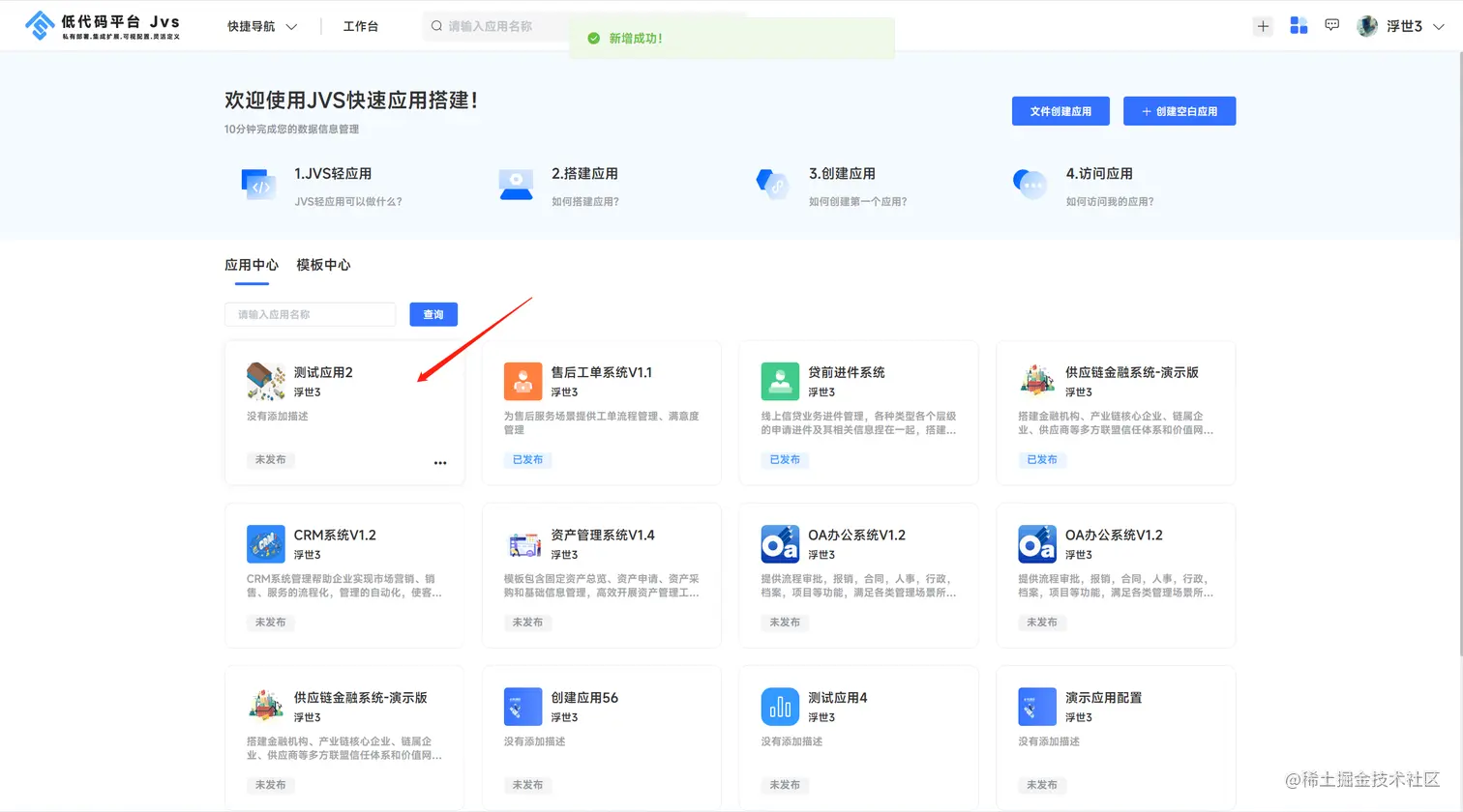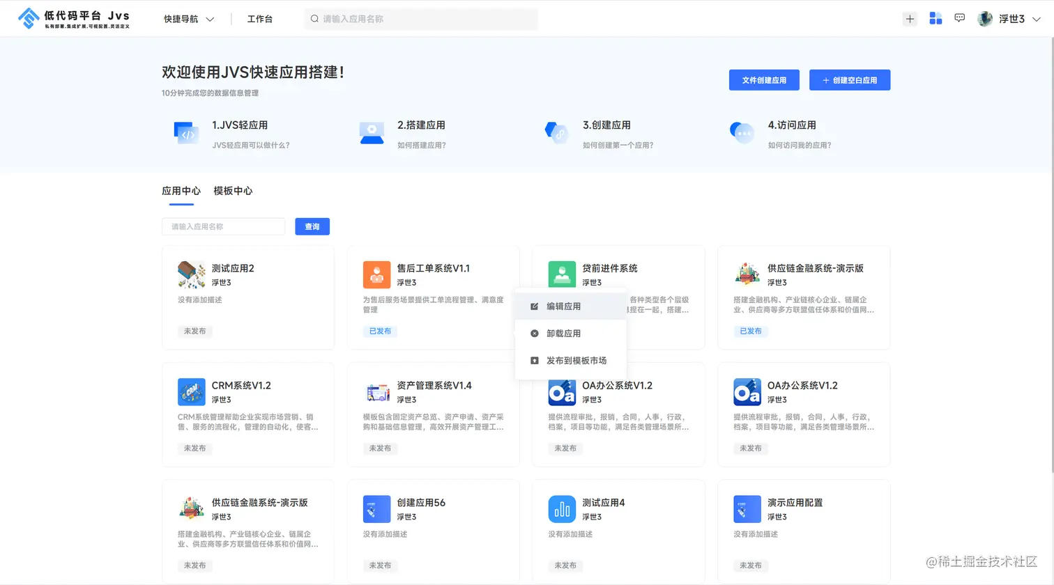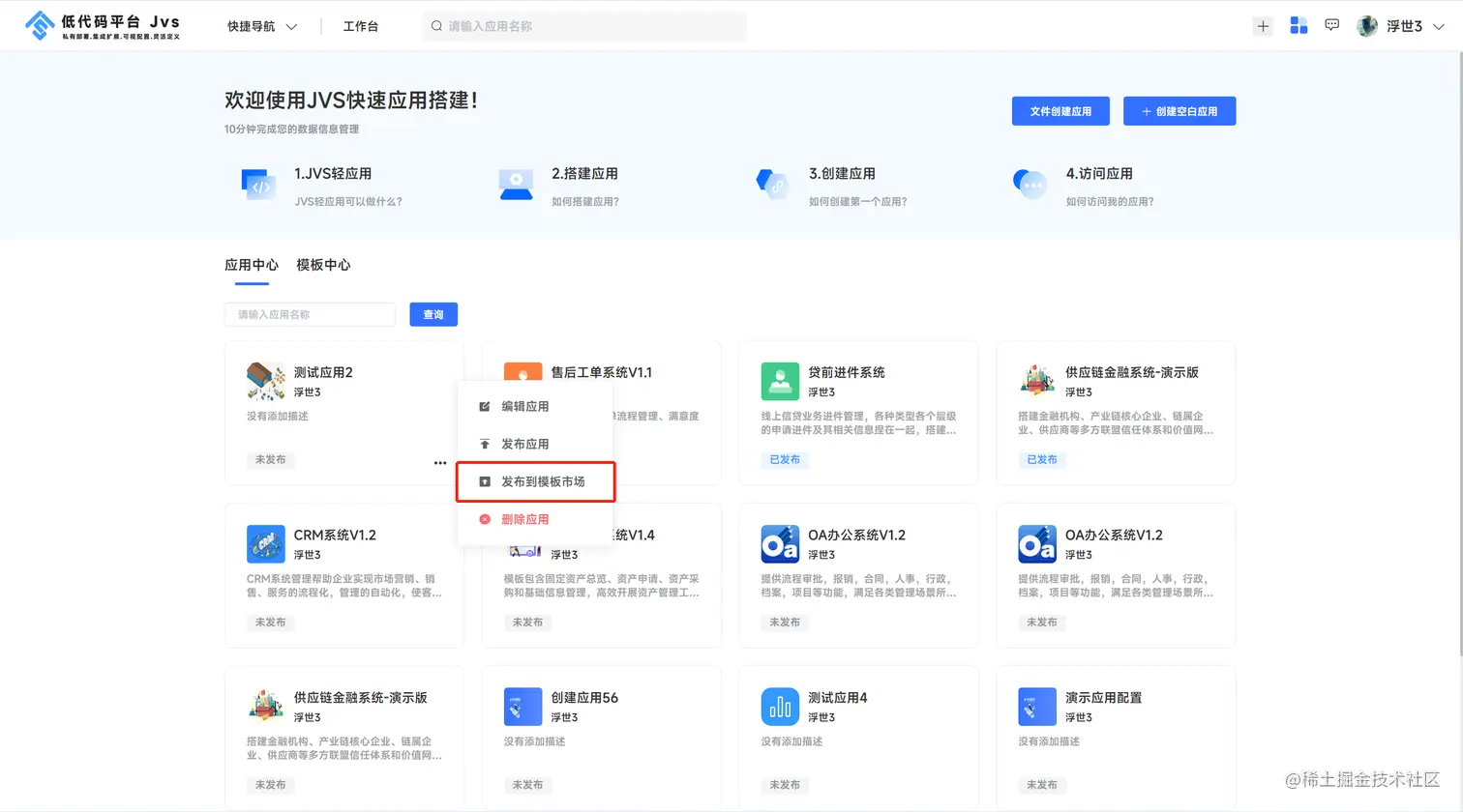 一旦发布为模板,那么就在模板中心可见了,每个有应用管理权限的用户 可以通过模板安装该应用。