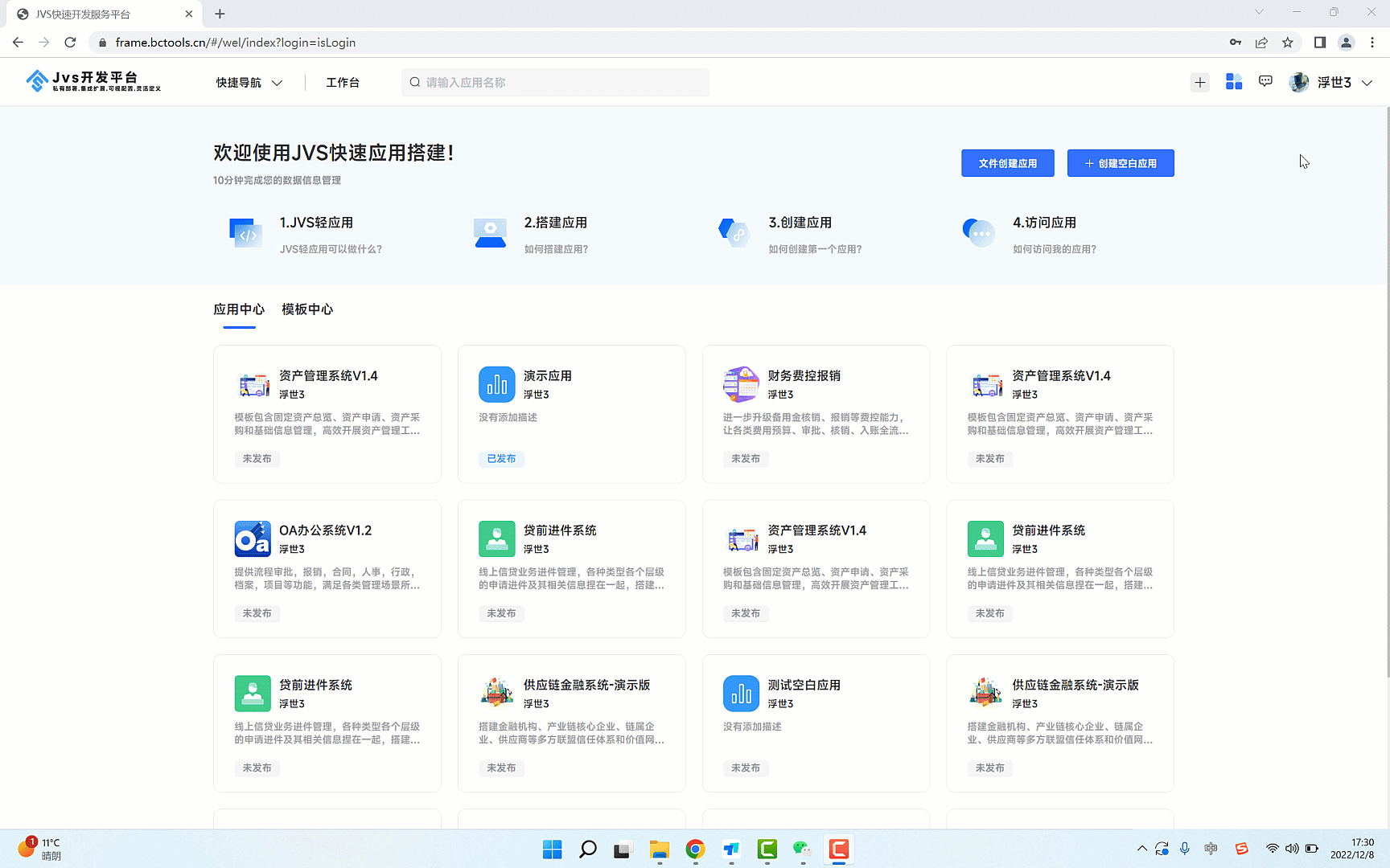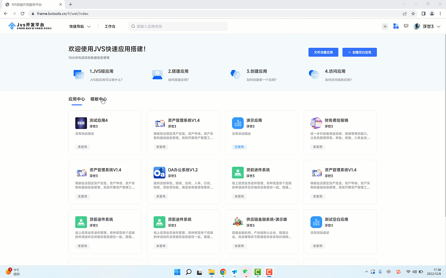 下图所示,应用配置中心 展示了 当前已经存在的轻应用与系统提供的应用模板。