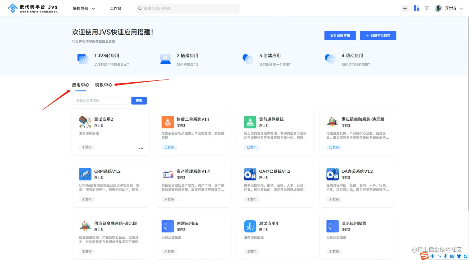 应用中心包含三个部分:创建应用、我的应用、应用模板