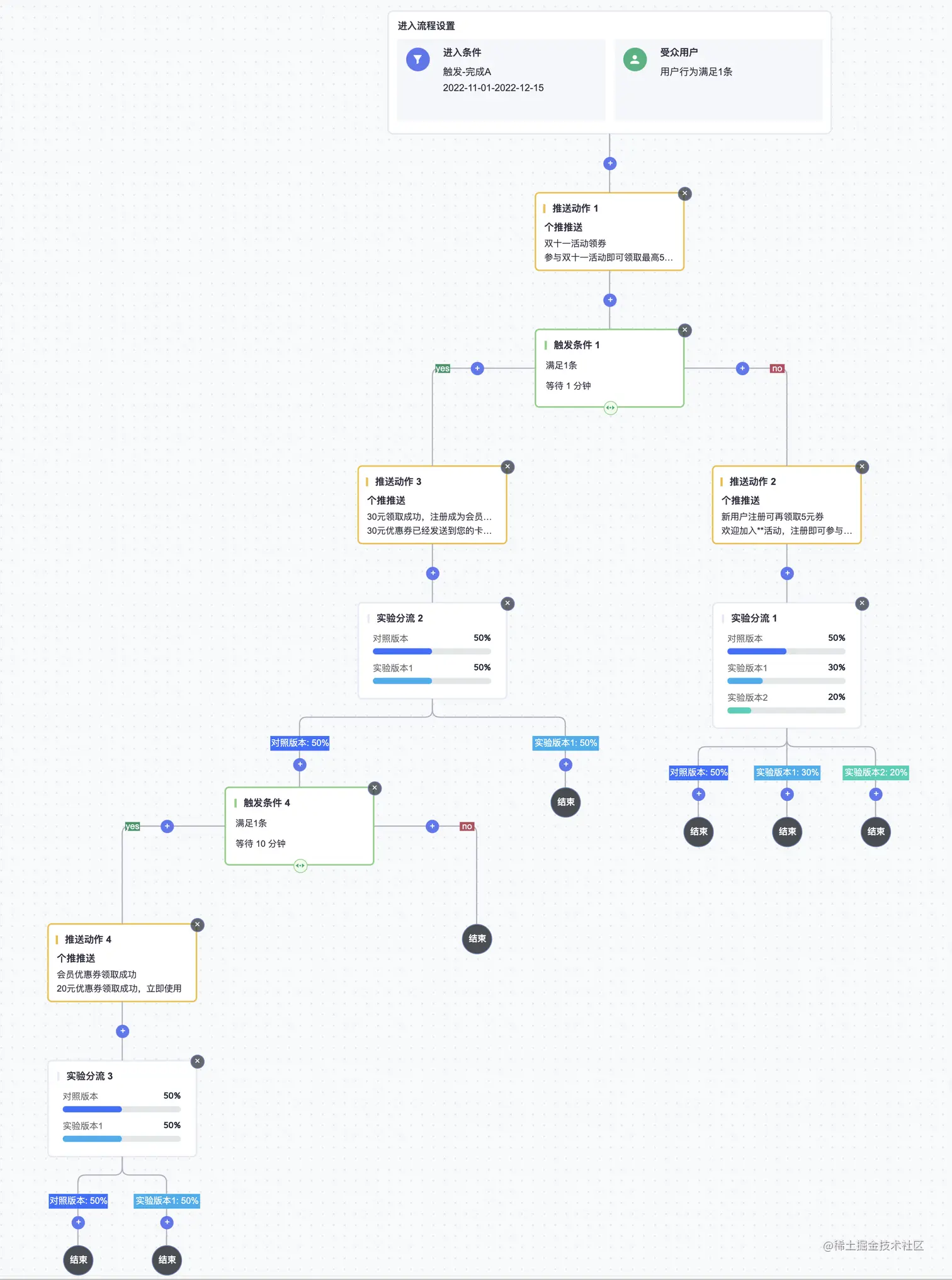以往的常规 A/B 实验只能基于推送时机、推送文案、推送渠道等单个事件分别进行实验;而「流程画布」实验却可以将多个事件组合起来,实验不同事件的组合及顺序的变化,综合评估策略的好坏。可组合的事件包括触达顺序、推送时机、推送次数、推送间隔、推送文案等。