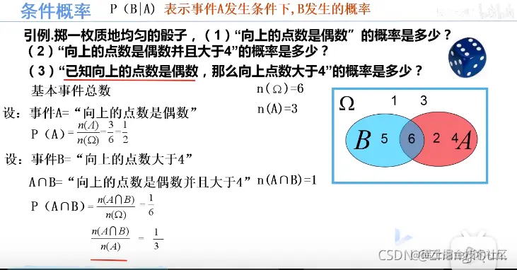 条件概率是指事件A在另外一个事件B已经发生条件下的发生概率。 条件概率表示为: P(A|B), 读作“在B条件下A的概率”。