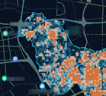 在完成上述五步动作之后,我们将清洗去重后的数据与划分的居住工作地围栏进行匹配,即可快速统计所需范围内的居住和办公人口数量,最终计算得到的数据分布情况示例如下图:图中的蓝色虚线,是自定义圈选的范围,图中的栅格,则代表了人口的分布密度。