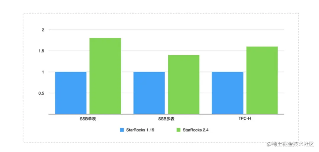 (StarRocks 2.4 在 SSB单表、SSB多表、TPC-H三个标准测试集下,相比于去年同期,性能提升了50%-80%。在物化视图、资源隔离、Query Cache、自动化数据分布、导入优化等各个核心功能均有重大突破)