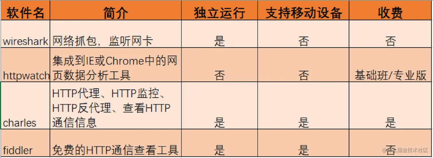 说到抓包工具,有Fiddler、Charles、HttpWatch、WIRESHARK等知名、不知名的......当然工具没有强弱好坏之分,只是看在什么场景下使用更为适合!Fiddler和同种类型的抓包工具对比,如下图所示: