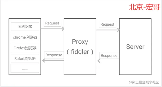 Fiddler的原理简单点说就是通过改写HTTP代理然后让网络数据从Fiddler这边通过 这样子来监控并且截取到网络信息数据。当你打开Fiddler的时候, 就已经设置好了浏览器的代理了。当你关闭的时候,它会自动的帮你把代理还原。这里还要清楚一点的就是 浏览器默认走的是我们的系统代理,其实这里的代理监听 就是在 请求和响应之间插了一脚, 让fiddler成为系统代理。