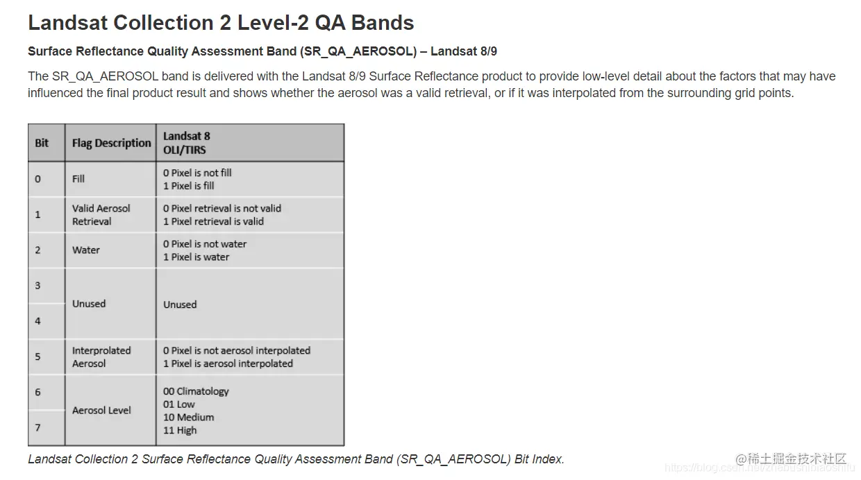 随后,开始依据QA波段进行数据筛选与掩膜。其实各类遥感影像(例如MODIS、Landsat等)的QA波段都是比较近似的:通过一串二进制码来表示遥感影像的质量、信息等,其中不同的比特位往往都代表着一种特性。例如下图所示为Landsat Collection 2 Level-2的QA波段含义。