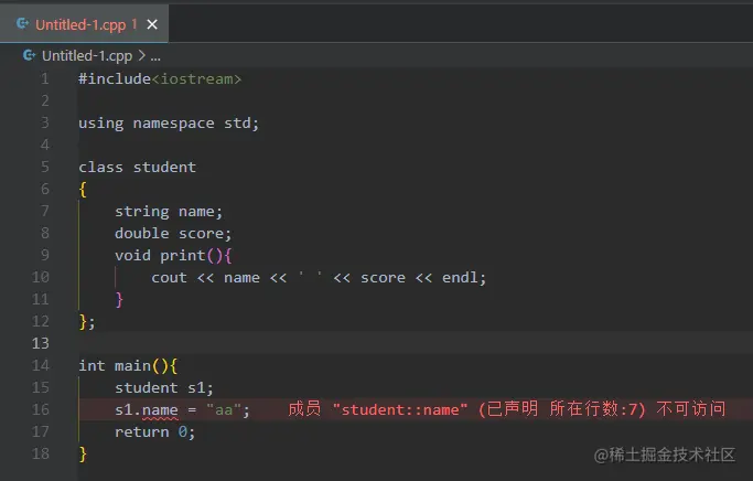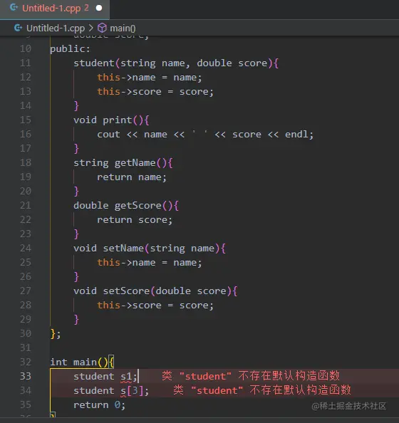 这时候有了构造函数,C++就不会再给我们创建默认构造函数,也就是不带参数的构造函数(或者参数带有默认值),所以如果定义变量不带参数就会报错