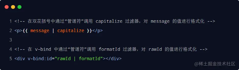 过滤器应该被添加在 JavaScript 表达式的尾部,由“管道符”进行调用,示例代码如下: