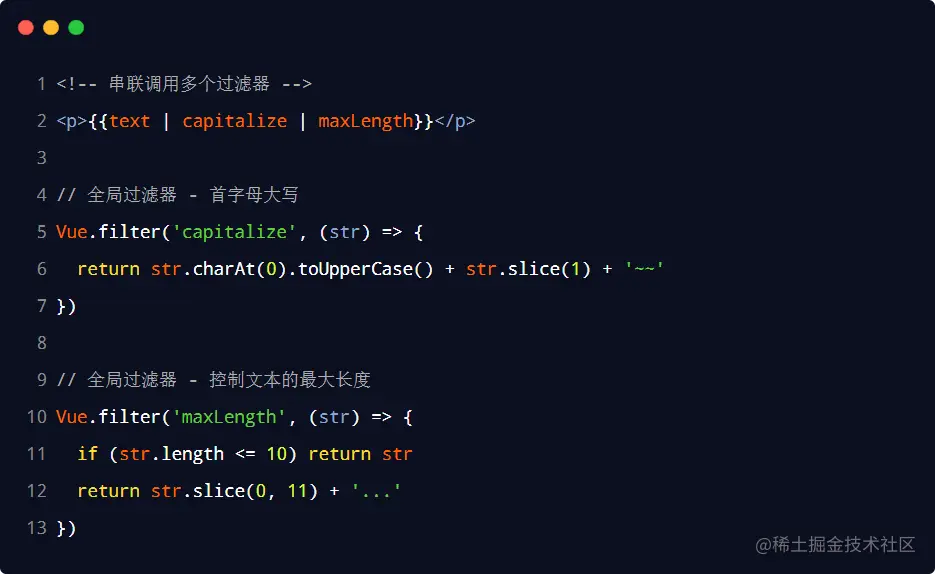 如果希望在多个 vue 实例之间共享过滤器,则可以按照如下的格式定义全局过滤器: