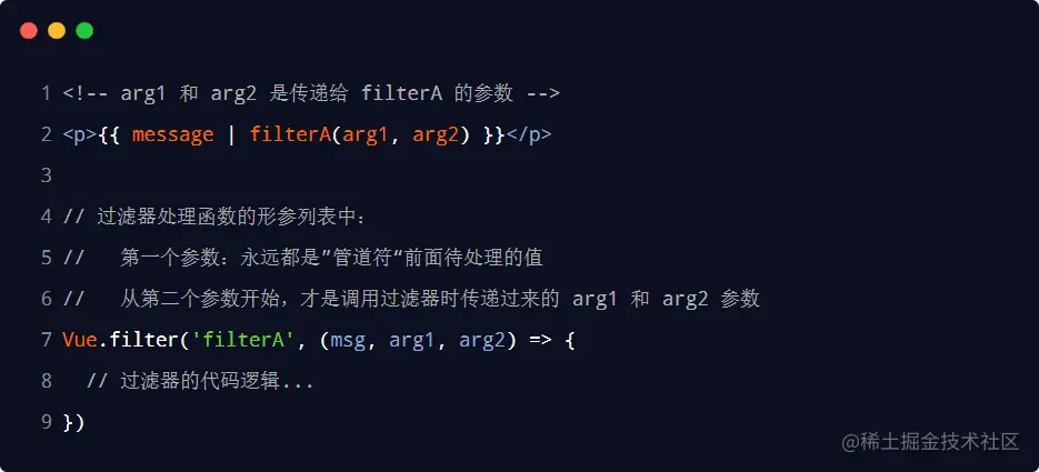 过滤器的本质是 JavaScript 函数,因此可以接收参数,格式如下: