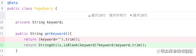 正确代码: return StringUtils.isBlank(keyword)?keyword:keyword.trim();