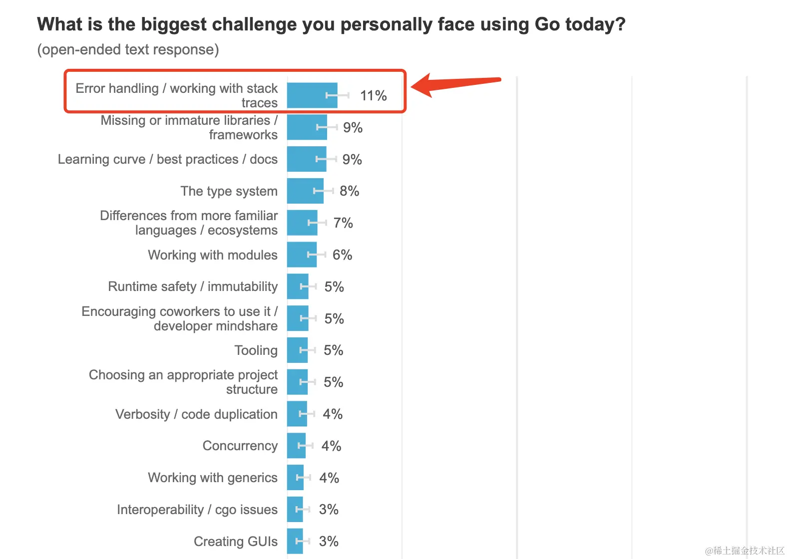 随着 Go1.18 泛型的发布,原先矛盾最深的泛型已经得到一个初步的解决方案。在社区调研上,开发者在使用 Go 时面临的最大挑战已经转移到了错误处理上,需要投入精力去 “解决” 它。