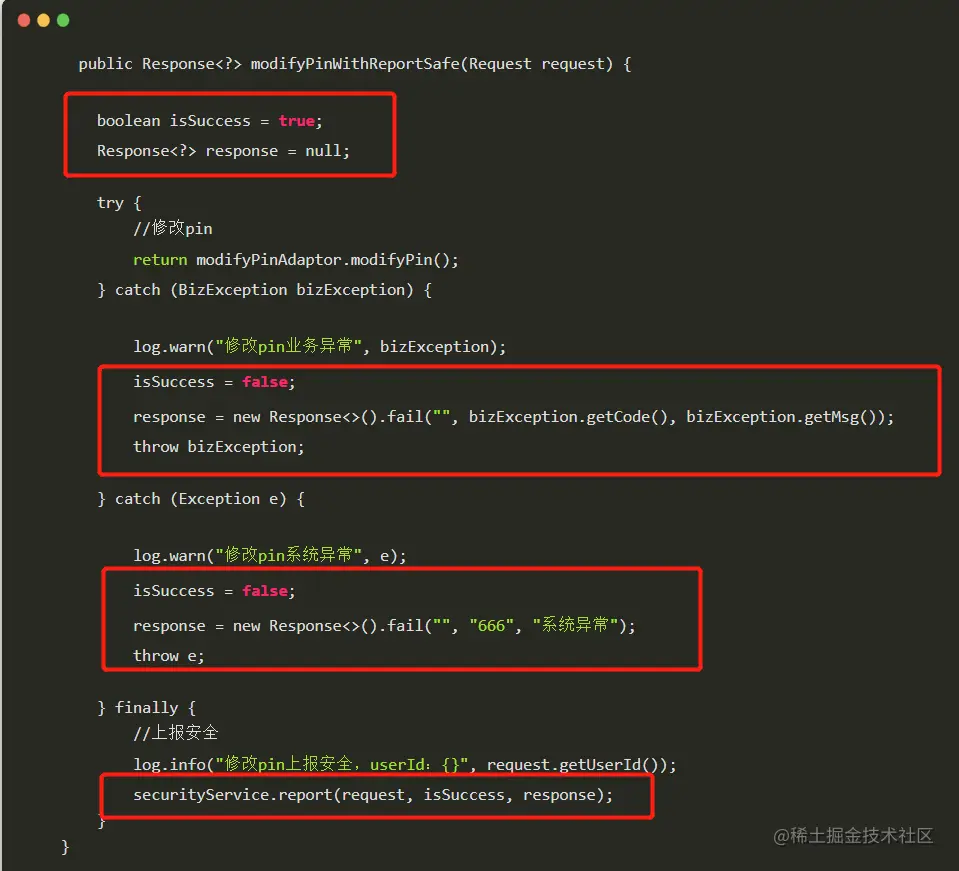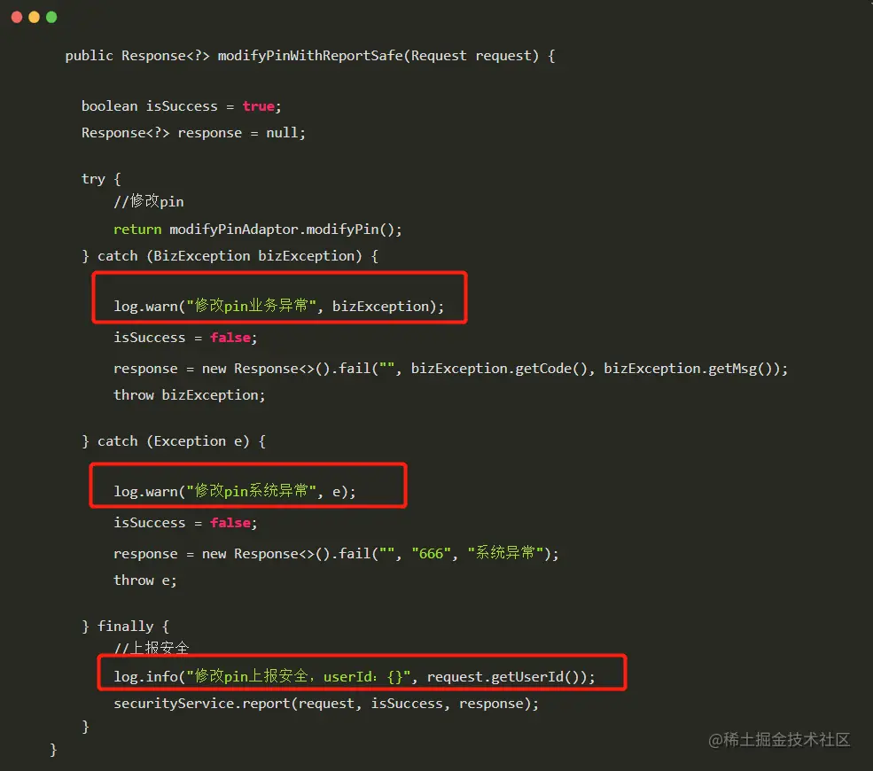 因为原来的方法,try-catch-finally的分支都是有打印日志的,是不是直接把原来代码搬过来就可以了?不是的,因为原来每个业务场景(如修改pin和修改密码)的日志打印会有点不一样,即需要区分业务场景