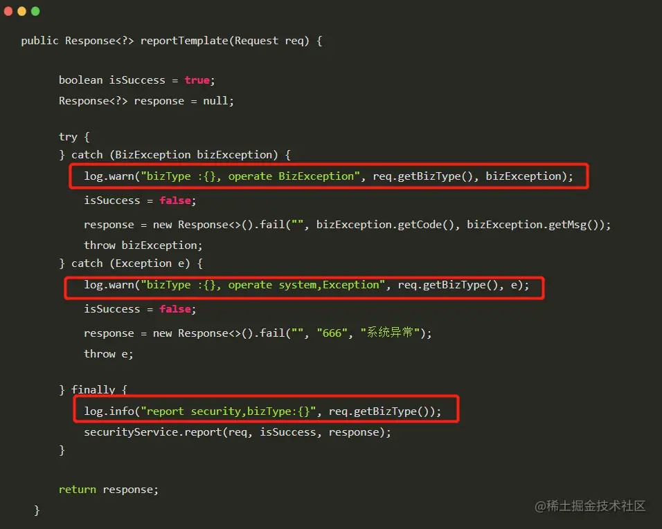 为了写出更优雅、更简洁的代码,我们需要学会如何抽取一些通用的基础模板。包括一些try-catch-finally代码块,有时候也是有共性的,比如本文,就是try-catch-finally代码块都在处理为上报的逻辑服务,因此可以抽取个上报通用模板。