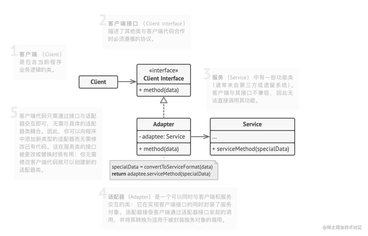 - 创建一个中间层类, 其可作为代码与遗留类、 第三方类或提供怪异接口的类之间的转换器