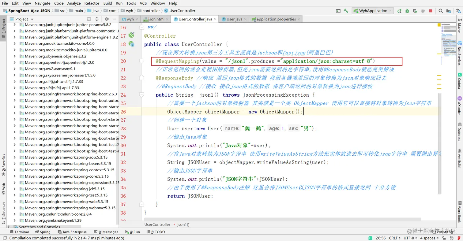 @RequestMapping(value = "/json1" ,produces = "application/json;charset=utf-8" )