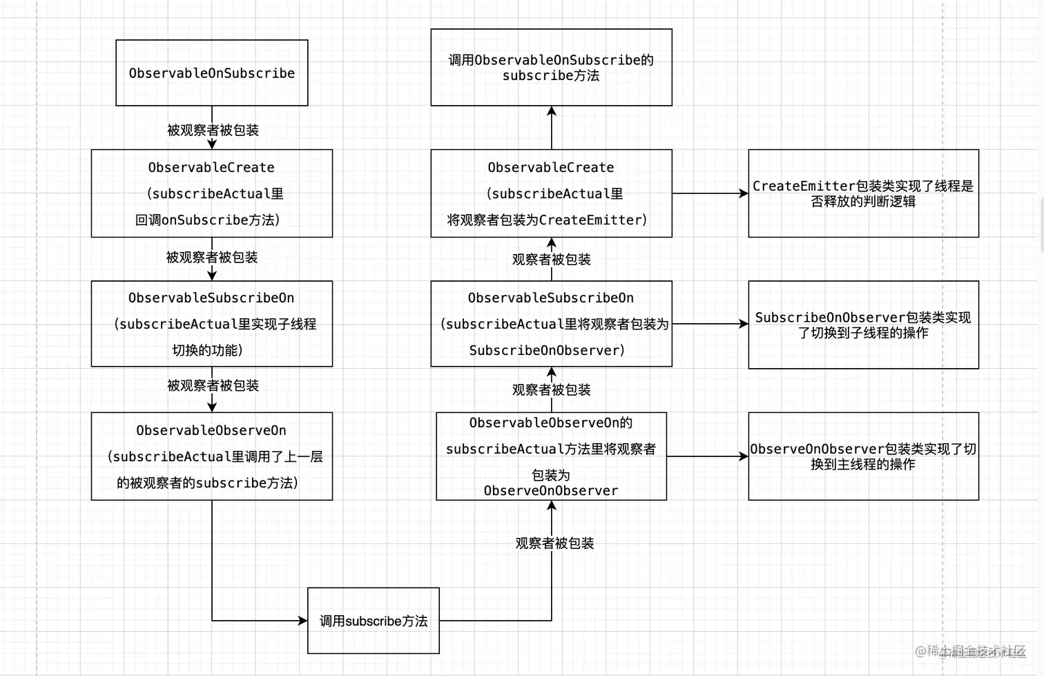 我们在创建被观察者的时候,会对被观察者做一层包装,创建几次就包装几次,然后在被观察者调用subscribe方法时,一层层回调被观察者的subscribeAcutal方法,而在被观察者的subscribeAcutal方法里,会对观察者做一层包装;
