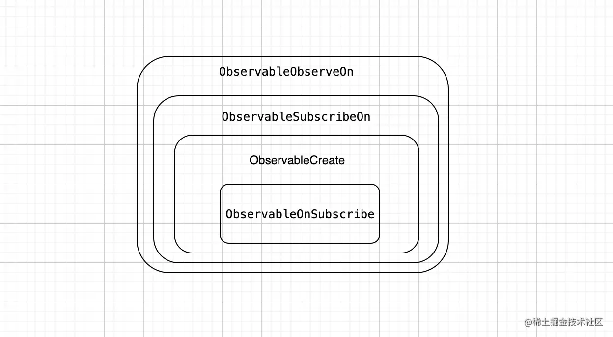 第三步的observerOn方法调用时,进行了第四层的包装,那么结构就是下面的样子