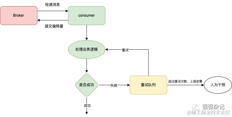 通用的方案是设计重试队列,当业务逻辑处理失败时,交由重试队列去处理,当重试超过一定次数,则需要告警人为干预。