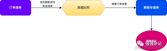 还是上文的场景,虽然订单服务和购物车服务归属于不同的服务,但是服务之间的协作可以通过消息队列实现。