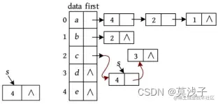 • 节点c 的邻接点是节点d、e ,其邻接点的存储下标为3、4,按头插法将其放入节点c 后面的单链表中;