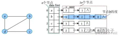 在上图中,节点数n =4,边数e =5,则在该图的邻接表中,节点表有4个节点,邻接点表有10个节点。节点a 的度为2,其后面单链表中的节点数为2;节点b 的度为3,其后面单链表中的节点数为3。