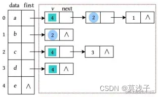 • 节点e 没有邻接点,其后面的单链表为空。