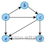 在有向图邻接表中很容易找到节点的出度,但是找入度很难,需要遍历所有邻接点表中的节点,查找到该节点出现了多少次,入度就是多少。例如在下图中,节点c 的下标为2,在邻接点表中有两个为2的节点,因此节点c 的入度为2;节点e 的下标为4,在邻接点表中有3个为4的节点,因此节点e 的入度为3。